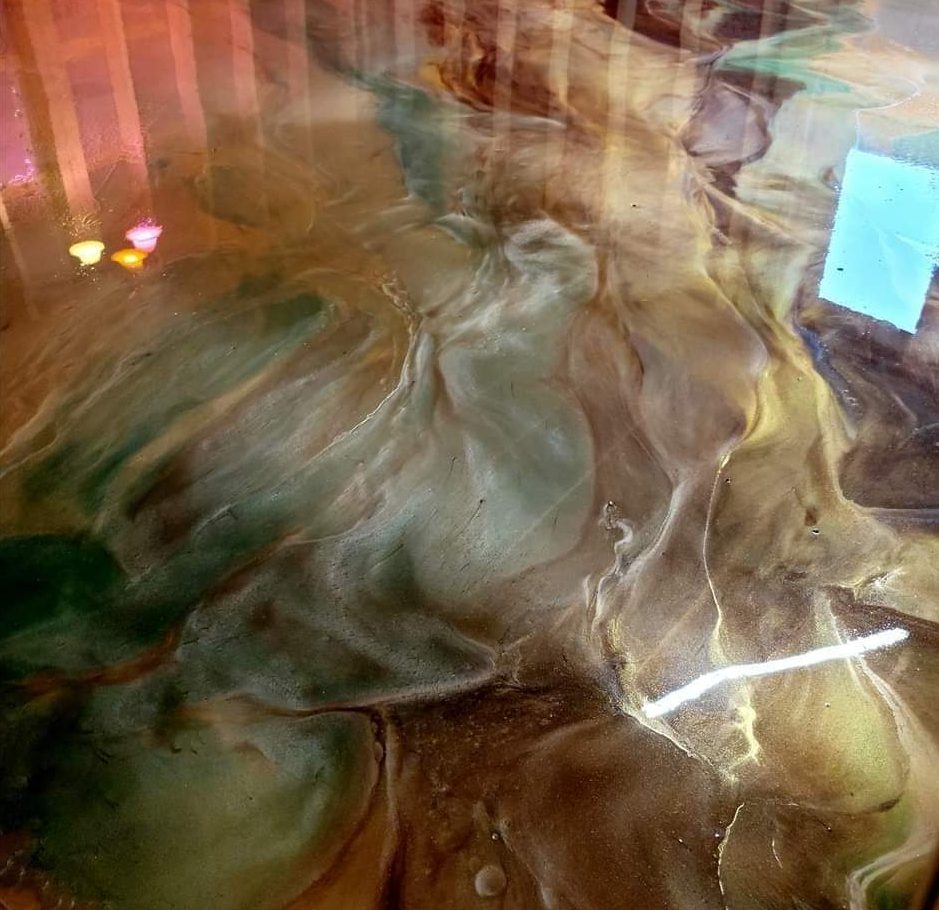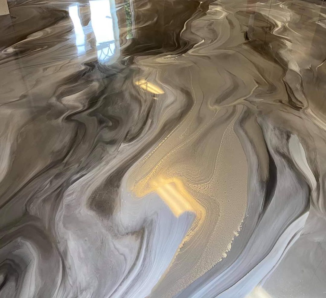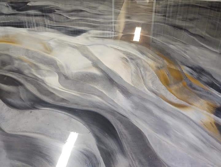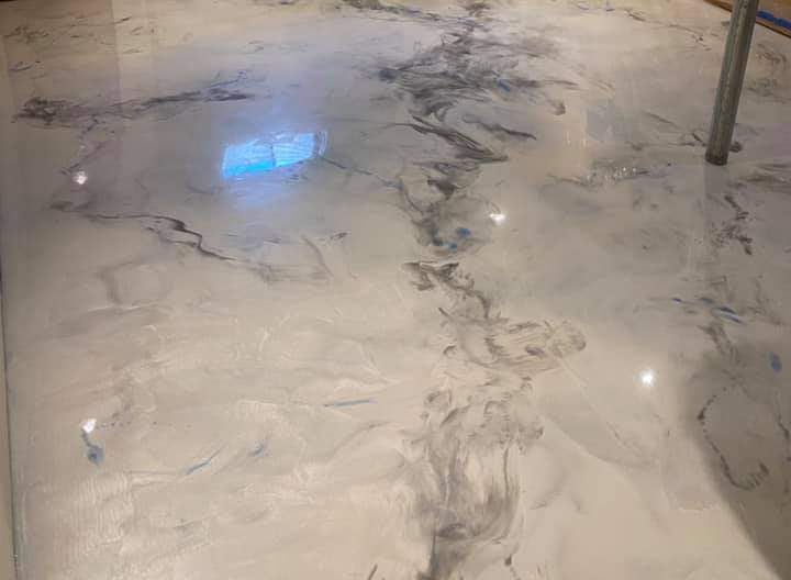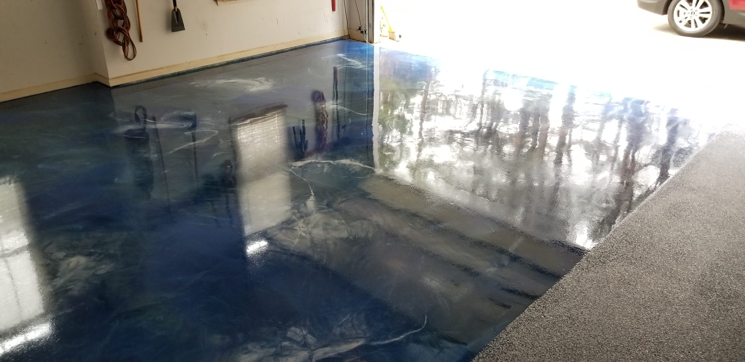 - We then apply a 2nd coat of epoxy using different metallic pigments/colors and can create unique designs with squeegees, leaf blowers and other techniques and then let dry.