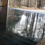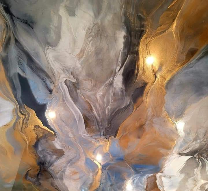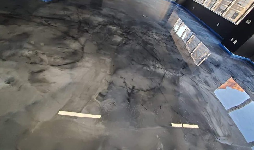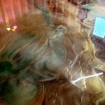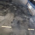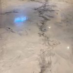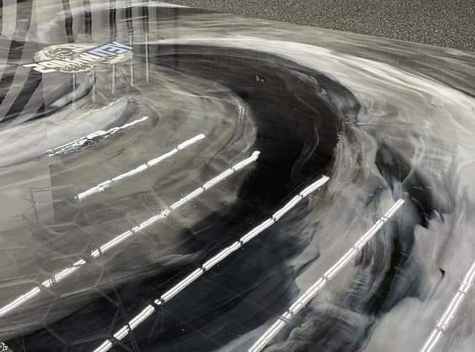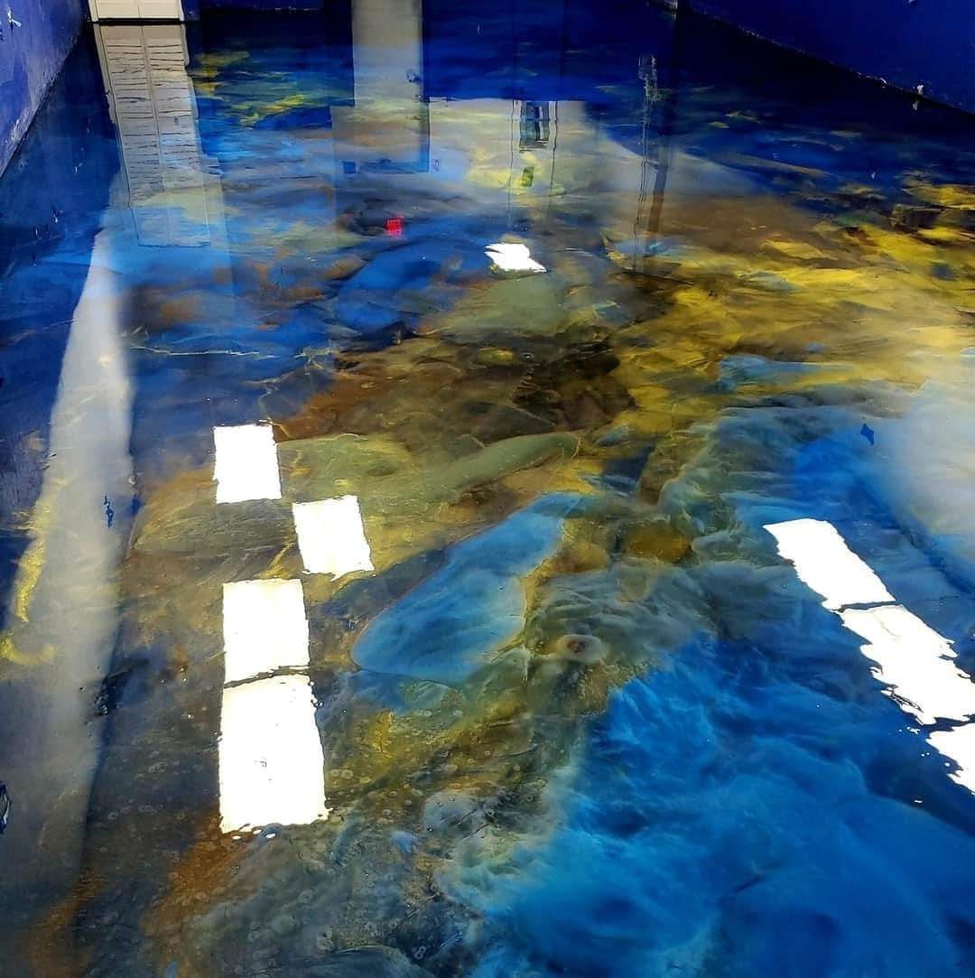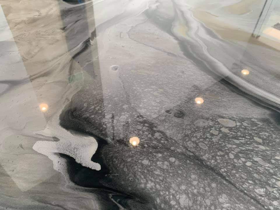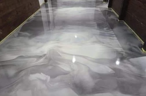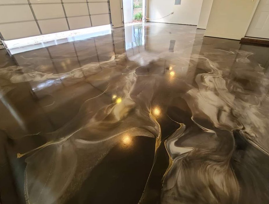 - We then apply a 2nd coat of epoxy using different metallic pigments/colors and can create unique designs with squeegees, leaf blowers and other techniques and then let dry.