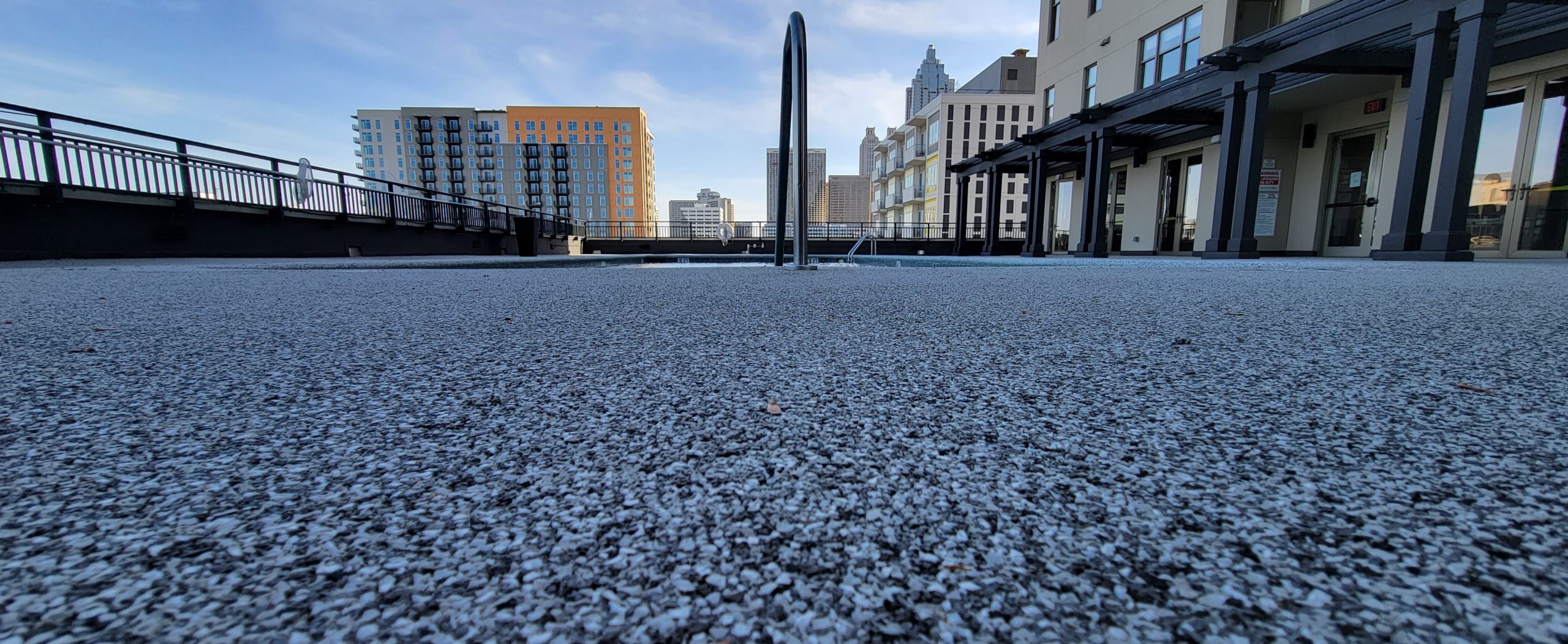 • Rubber Urethane: Non-slip, porous so never any puddles, soft under your feet and with light colors can be up to 10 degrees cooler than natural concrete.